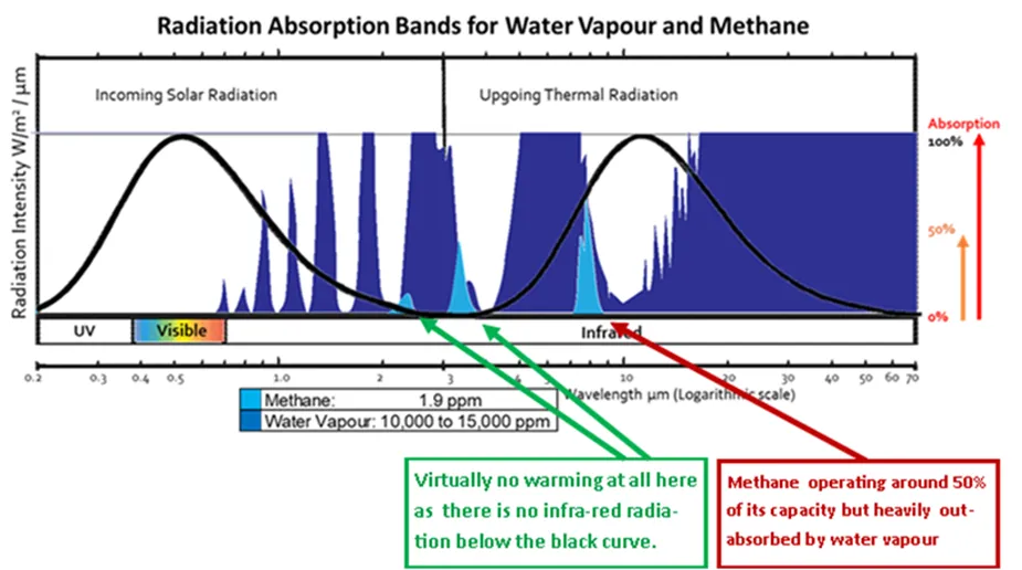 But wait! There’s more. The other wavelength that methane operates in is dominated by water vapour. For every two methane molecules trying to interact with the out-going radiation there are 5,000 to 8,000 H2O molecules all chasing the same radiating energy. Methane doesn’t get a look in.
