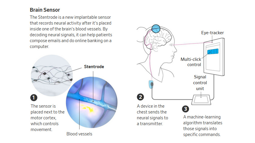 That brain activity is collected by sensors implanted in a blood vessel in Mr. O’Keefe’s brain and relayed to a computer through devices in his chest. The signals are converted to a mouse click or zoom-in on his screen with the help of machine-learning software.