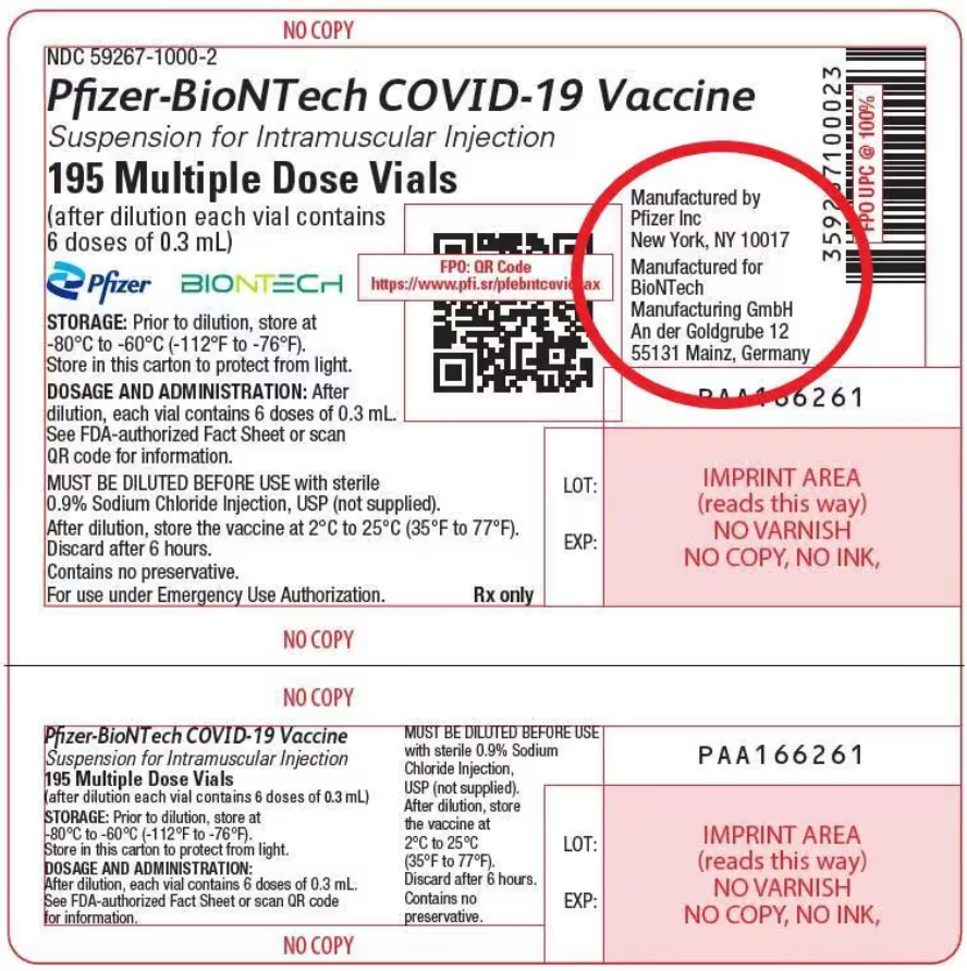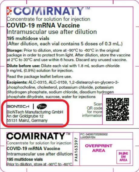 A more recent product label using the “Comirnaty” trade name dispenses with “by” and “for” and the Pfizer address altogether and, while politely still including the Pfizer logo, simply indicates BioNTech as manufacturer.