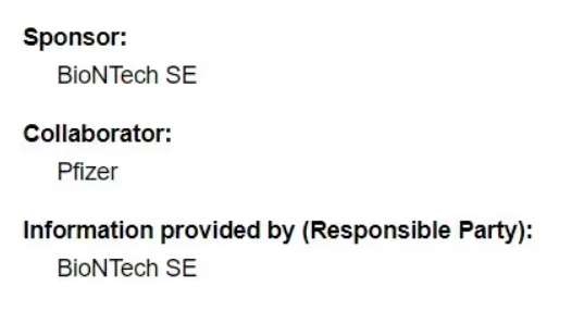 This primacy of BioNTech in the manufacturing of the drug also applied, not surprisingly, in the authorization process. The sponsor of and “responsible party” for the clinical trial that has been the target of so much suspicion and criticism was BioNTech, not Pfizer. The clinical trial entry merely lists Pfizer as “collaborator.”