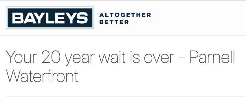 “Your 20-year wait is over-Parnell Waterfront” was a recent Bayleys heading for an Auckland residential property.