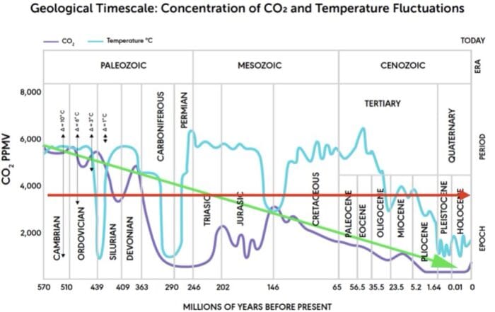 Greenpeace co-founder, and close CFACT friend, Patrick Moore shared the graph above, which reminds us that on a geological time scale, we’re actually living in a “coldest ever” period for the Earth.