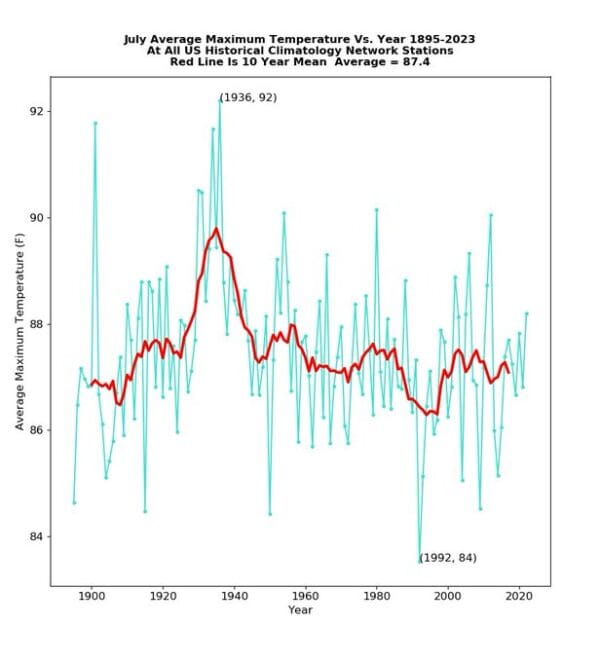 Climate data expert Tony Heller posted the graph above and tweeted, “the five hottest Julys in the U.S. were 1936, 1901, 1934, 1930 and 1931.”