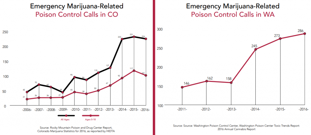 Washington has seen a 70% increase in calls between the three-year averages before and after legalisation. The Washington Poison Control reported 378 cases of toxic exposure to marijuana in 2017. A study conducted in Washington State found that the rate of pediatric exposures to marijuana (children aged 9 or under) was 2.3 times higher following retail sales than it was before legalization (Thomas, et al., 2019).