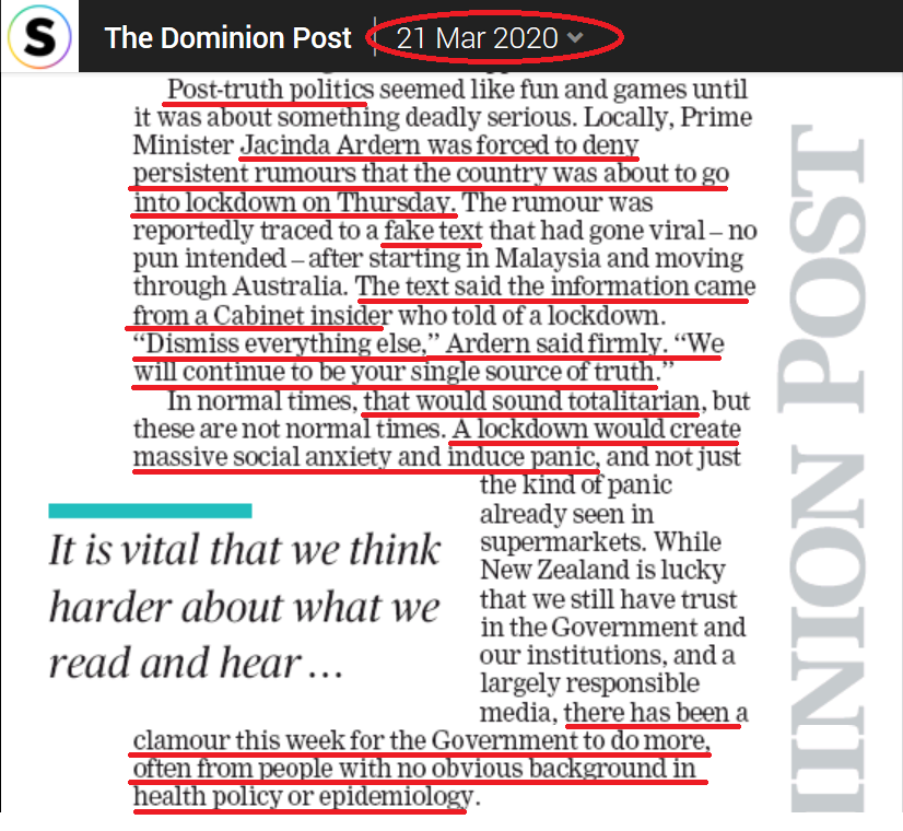 Do you remember when the lefty-press (almost all of them) said talk of a lockdown was fake news, totalitarian, and all that? Do you remember when they said it would cause massive social alarm and induce panic? Do you remember when Ms Ardern, the single source of truth, was ‘forced’ to deny it? Do you remember when we were told that it was “vital that we think harder about what we read and hear”