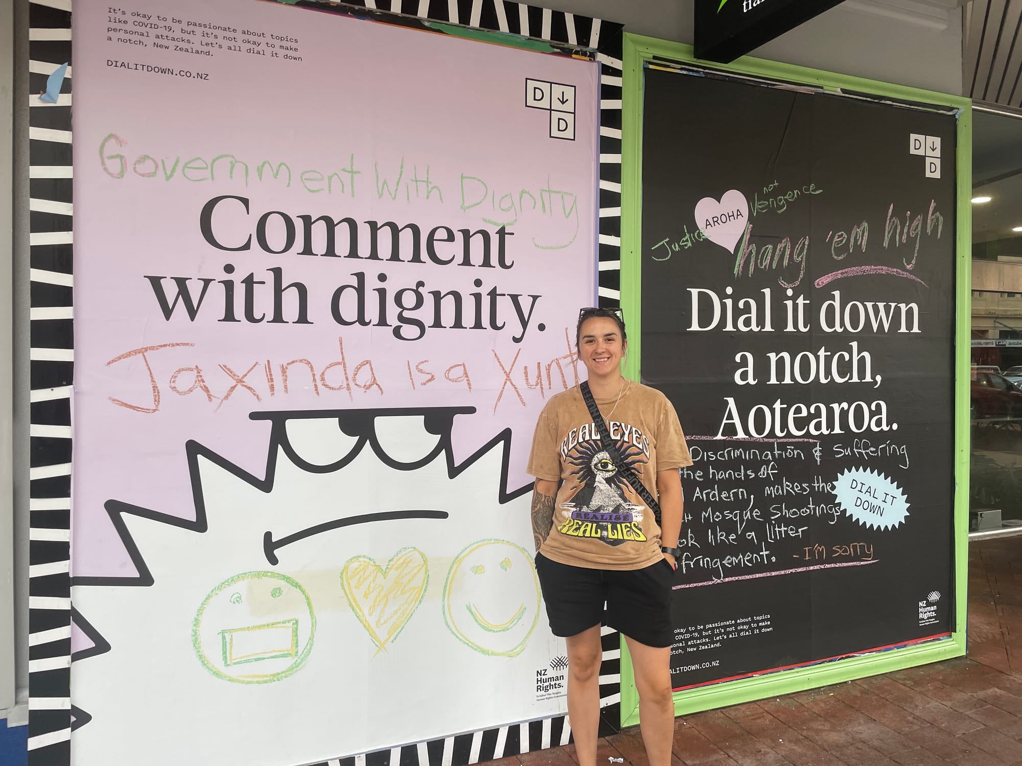 On my way to parliament grounds, I met Renee Palmer, who was admiring some subverted signage near Courtenay Place.