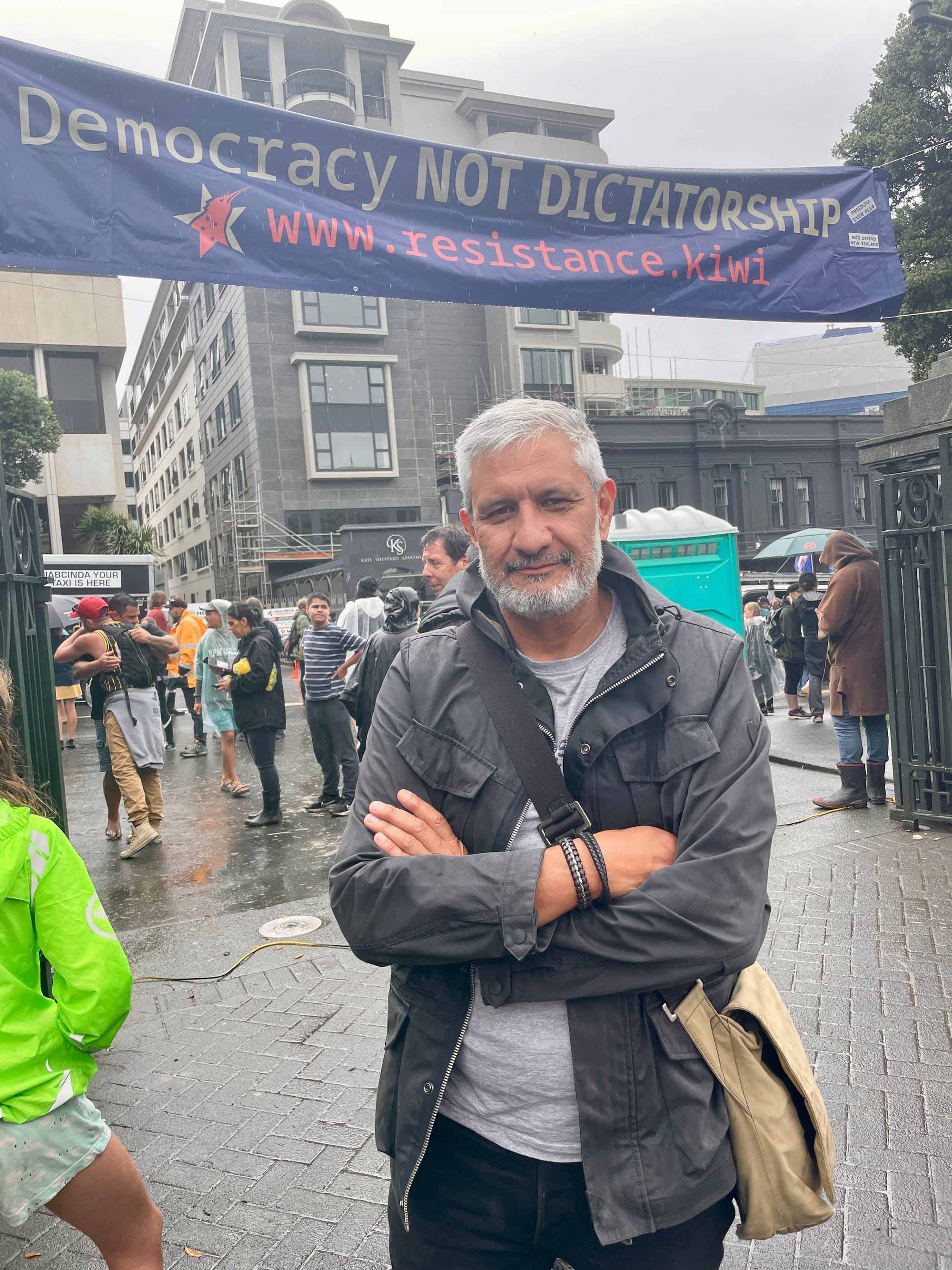 “I’m here for my kids and their kids and for everyone in New Zealand. I came down from Sanson on Tuesday, and I’ll be here until it’s over. I’ve been standing in the background and waiting for my time to stand up. The other protests didn’t feel right with me, but when I saw the convoy, that inspired me and I felt that this is the right time. So I came down and stood here and held the line.”