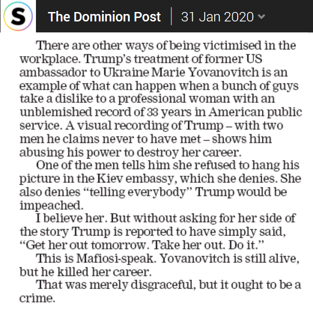 Such a meanie, Orange Man. Yovanovich wasn’t ‘gone tomorrow’, or the next day, or the next month, she wasn’t ‘gone’ until after she finished her tour in early April 2019, nearly a year later. Such a mean guy, that Trump.