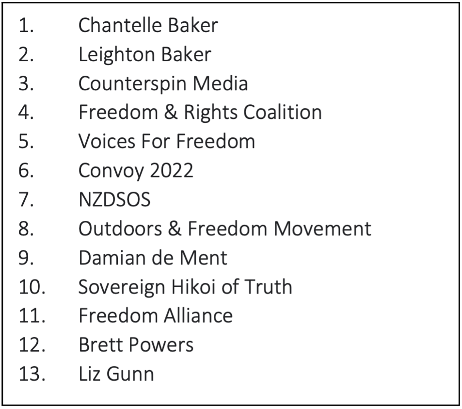 The twelve New Zealanders or groups named by the Disinformation Director are below, except they can’t even count! There isn’t a dozen, they have actually published thirteen names.