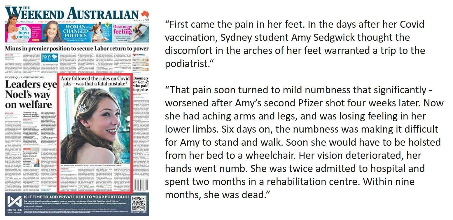 Amy was a young woman, 23 years old, with a stable underlying medical condition (hereditary spastic paraplegia) living a full life, not inhibited in any way. Prior to her receiving the Pfizer injection, she and her family had questioned whether it was safe with her underlying condition and had been reassured, though there was no basis for such reassurance, as studies on people with her underlying condition had not been undertaken.