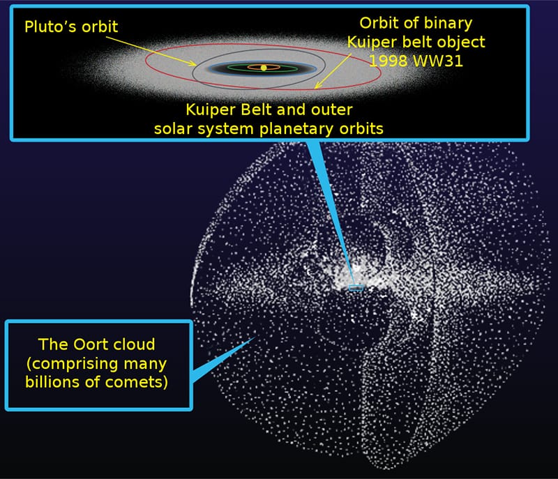 The Oort cloud is a sphere of billions of icy, rocky objects that orbit around the Sun at almost unimaginably vast distances: well, well beyond the orbit of Pluto. The Oort cloud is believed to be the remnants of the primordial cloud of dust that, billions of years ago, condensed into the Solar System. The leftover rubbish of the proto-planetary disk.