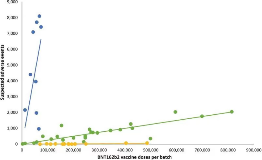 There are then the “blue batches” clustered around the blue line, which are obviously associated with an extraordinarily high level of adverse events. As Dyker notes, no more than 80,000 doses of any of the blue batches were administered in Denmark – suggesting that these especially bad batches may perhaps have been quietly pulled from the market by public health authorities.