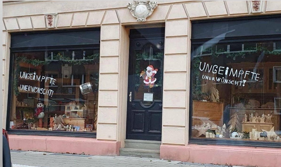 You’re wondering what the German on that shop window says, aren’t you? It says, “UNVACCINATED UNWELCOME!” It’s a familiar message here in Germany. Some of you might remember it from the 1930s, although it referred to a different group of people back then …