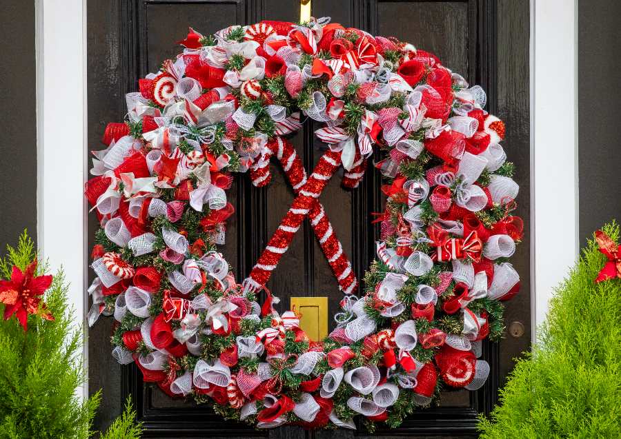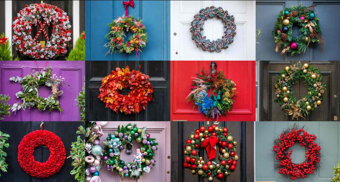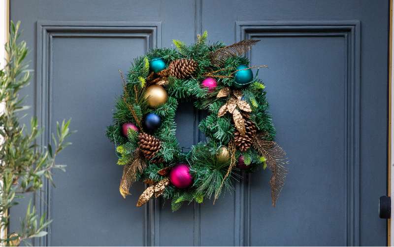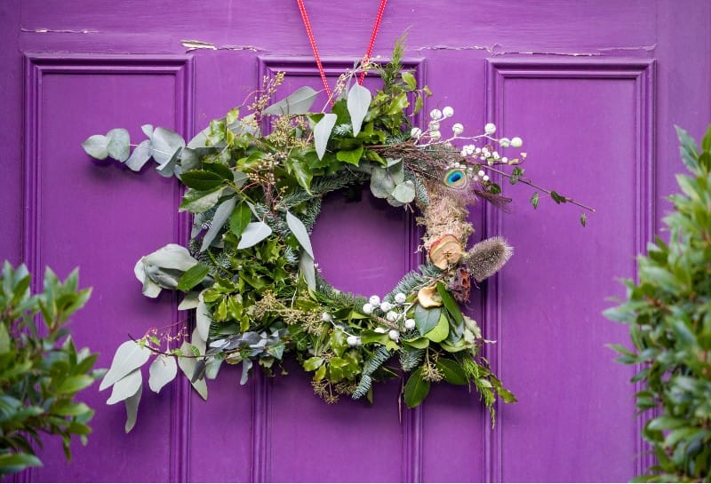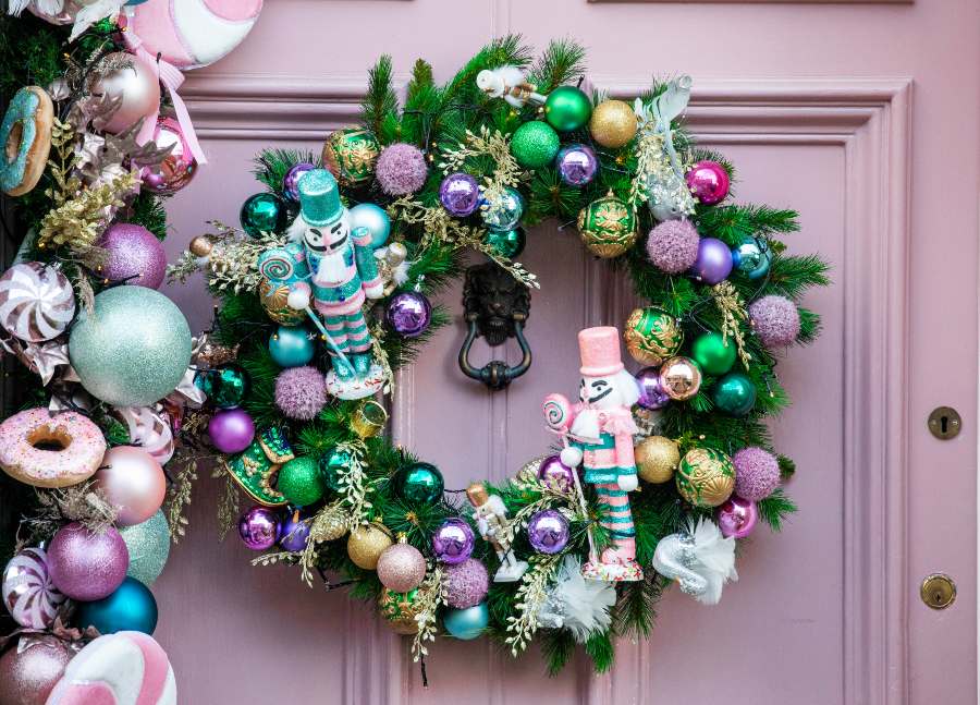 A Christmas staple, the wreaths adorned the pink, purple, blue, red, and yellow front doors of the townhouses, and were decked out with baubles, flowers, and greenery.