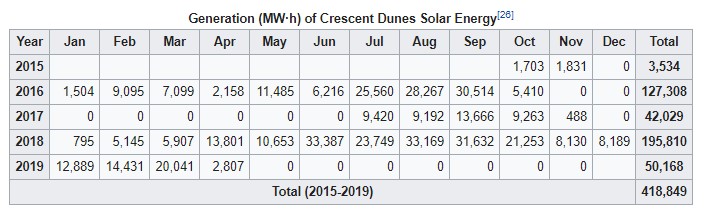 The plant was supposed to last 25 years and it was expected that Crescent Dunes would generate in excess of 500,000 MWh per year over those 25 years, for a total of 12,500,000 MWh. As you can see, the total production for the four years it was running never even met the one-year target. The total of 418,849 MWh is only 96.6% shy of the 25-year prediction. Pretty close really. Certainly a whole lot closer than KiwiBuild. 100,000 promised, 1535 delivered – 98.5% miss.