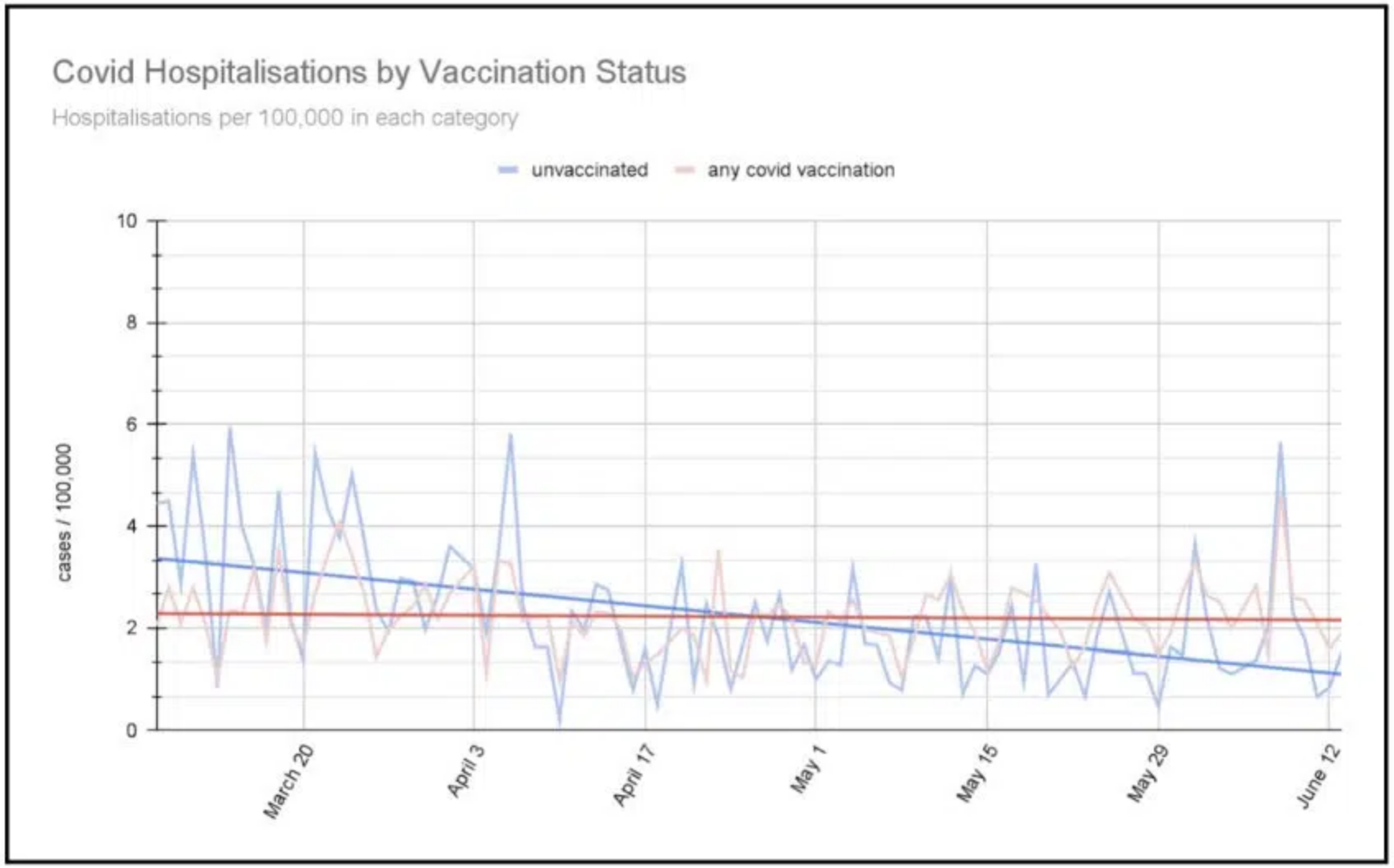 The light blue line indicates hospitalisations for unvaccinated, the light red for the vaccinated. These are rates per 100,000 population so they are strictly comparable.