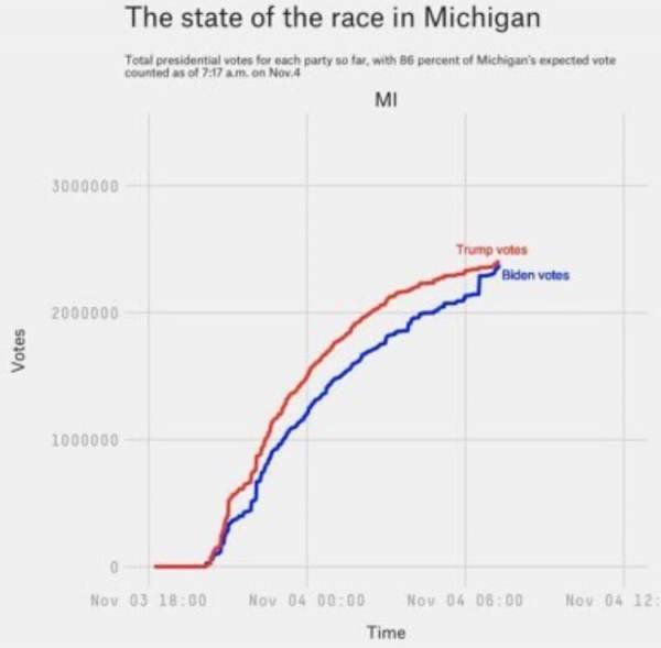 Suddenly 200,000 ballots for Biden appeared in a midnight ballot dump. Notice the vertical blue line showing the massive ballot dump for Biden. This is blatant fraud.