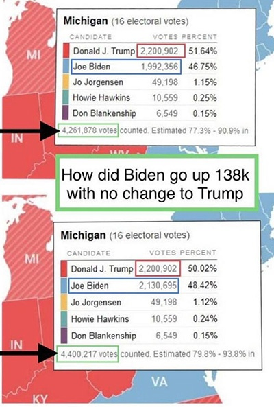 In Michigan Trump tri-hards alleged postal ballot voter fraud in Antrim County and Detroit.