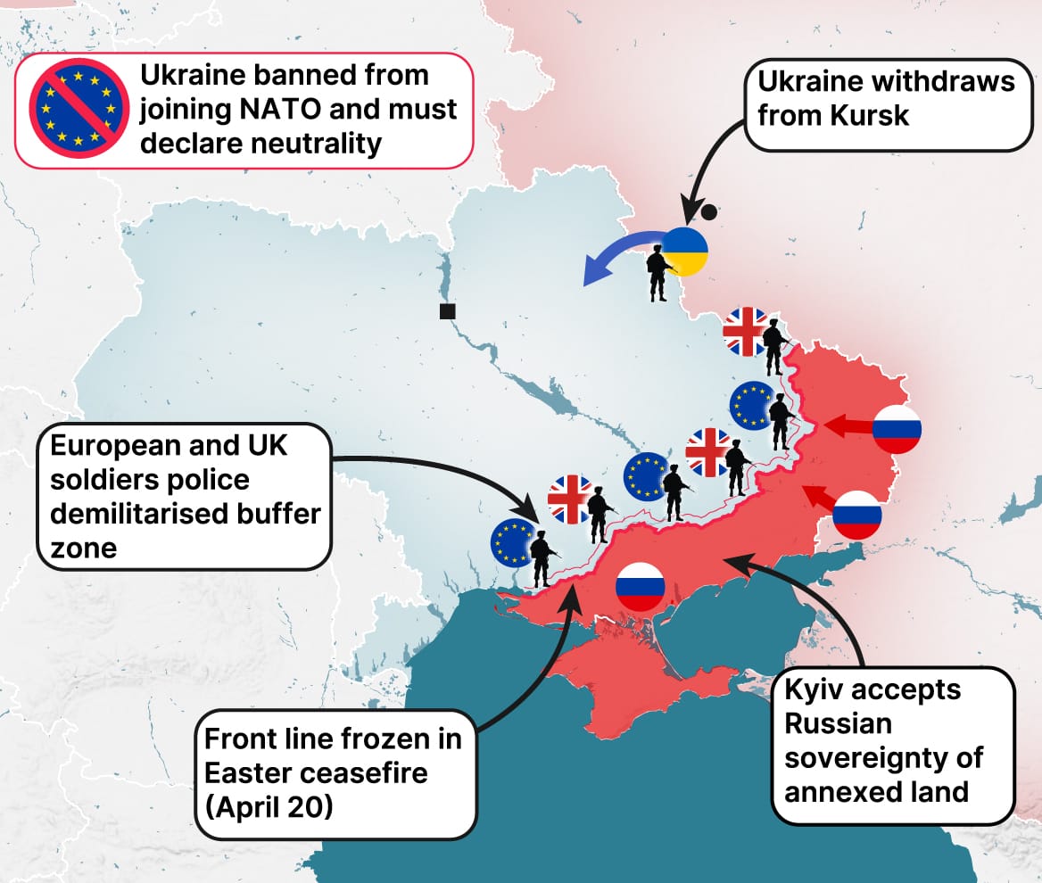 On top of this, Ukrainian troops will be made to leave Russia’s Kursk region, where it launched a counteroffensive in August, while a contingent of European soldiers, which could include British troops, would be asked to police a demilitarised zone. American troops will not be involved in this contingent.