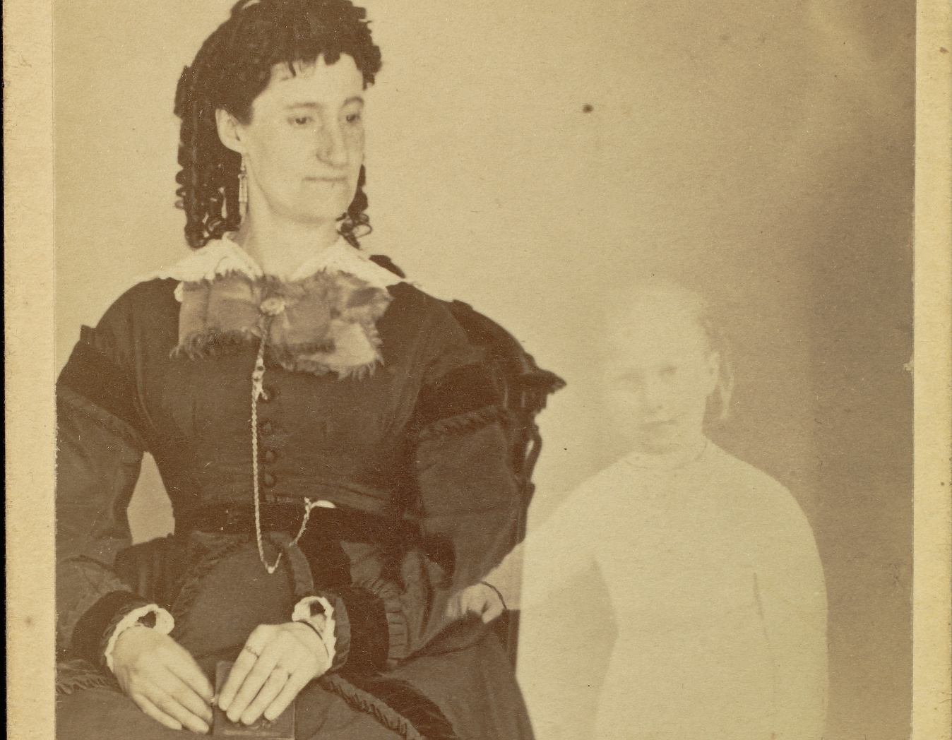 In 1861, Mrs. H.F. Stuart lists as a hair jewellery manufacturer at 221 Washington St. By 1862, H.F. Stuart expanded to establish her professional photography studios at 258 Washington St., the address associated with the first spirit photograph. Her continued production of hair jewellery is verifiable by the stamp on the back of her many commissioned carte-de-visite portraits.