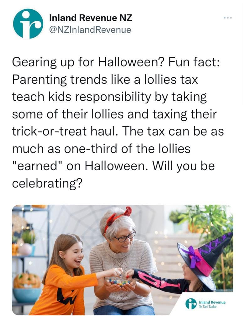 The Tweet from Inland Revenue posted yesterday read “Gearing up for Halloween? Fun Fact: Parenting trends like a lollies tax teach kids responsibility by taking some of their lollies and taxing their trick-or-treat haul. The tax can be as much as one-third of the lollies “earned” on Halloween. Will you be celebrating?”