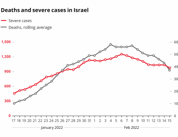 After hitting an all-time high in Covid cases earlier this month the Israeli Health Ministry data showed a drop in serious COVID cases on Tuesday. The Omicron wave drove Israel to a peak of 1,229 serious cases in early February, but that number fell to 974 on Tuesday after a slow in the past week. Vaccination did not prevent the highly vaccinated Israeli’s from getting sick and dying from Covid but they are on the downside of the virus curve.
