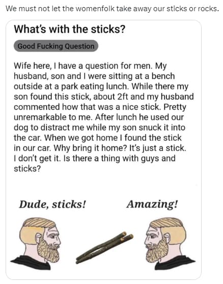In a recent social media post, a confused wife and mother wondered what it is about sticks that so fascinates the male of the human species. When her son found a “pretty unremarkable” – she thought – stick, he and her husband colluded to sneak it home. “Why bring it home? It’s just a stick. I don’t get it. Is there a thing with guys and sticks?”