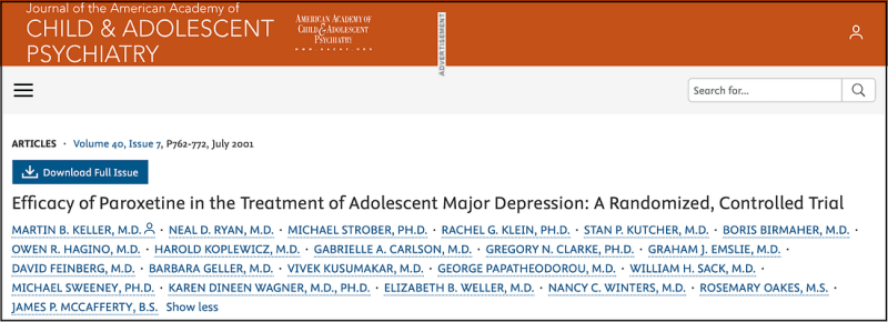 In 2001, the Journal of the American Academy of Child & Adolescent Psychiatry (JAACAP) published a paper declaring that the antidepressant paroxetine (Paxil) was “generally well tolerated and effective” for adolescent depression.