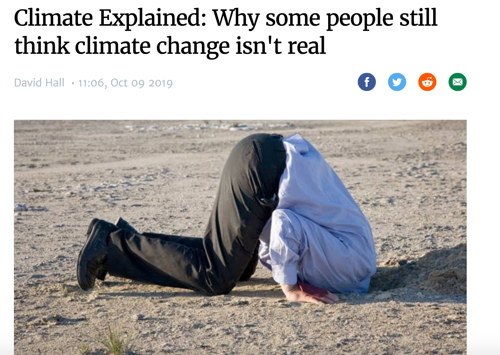 […] It could be that the idea of climate change is a threat to our worldview. Or it could be that we fear society’s response to climate change, the disruption created by the transition to a low-emissions economy. Either way, climate change becomes such an “inconvenient truth” that, instead of living with and acting upon our worries, we suppress the truth instead.