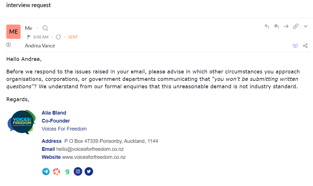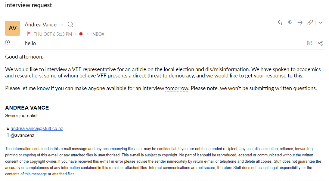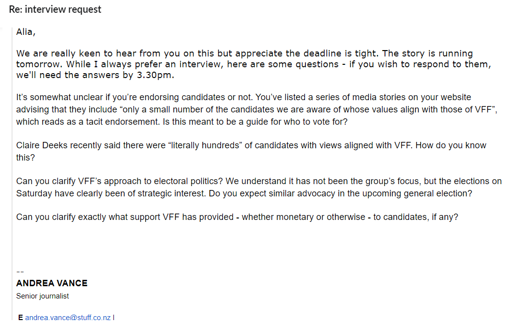 VFF has little faith of a verbal interview by Stuff being reported with integrity or context based on historical precedent. There is an absence of trust between VFF and Stuff reporters. This is as a direct consequence of ongoing false reporting by Stuff on VFF’s messaging and intentions. You may or may not be aware that there is currently an active Media Council investigation into a complaint made by VFF about recent Stuff reporting.