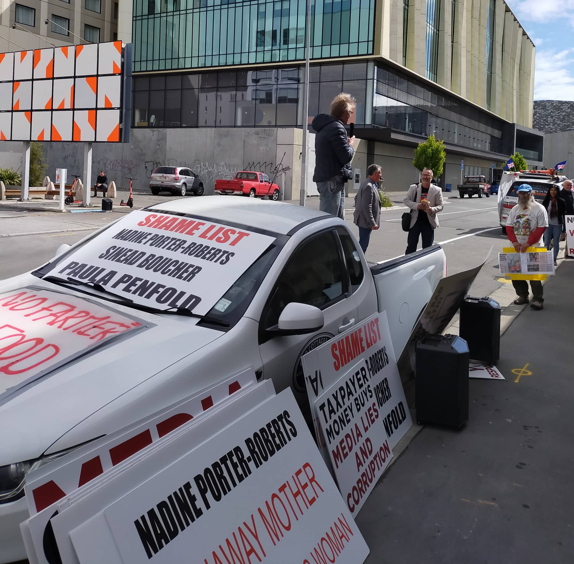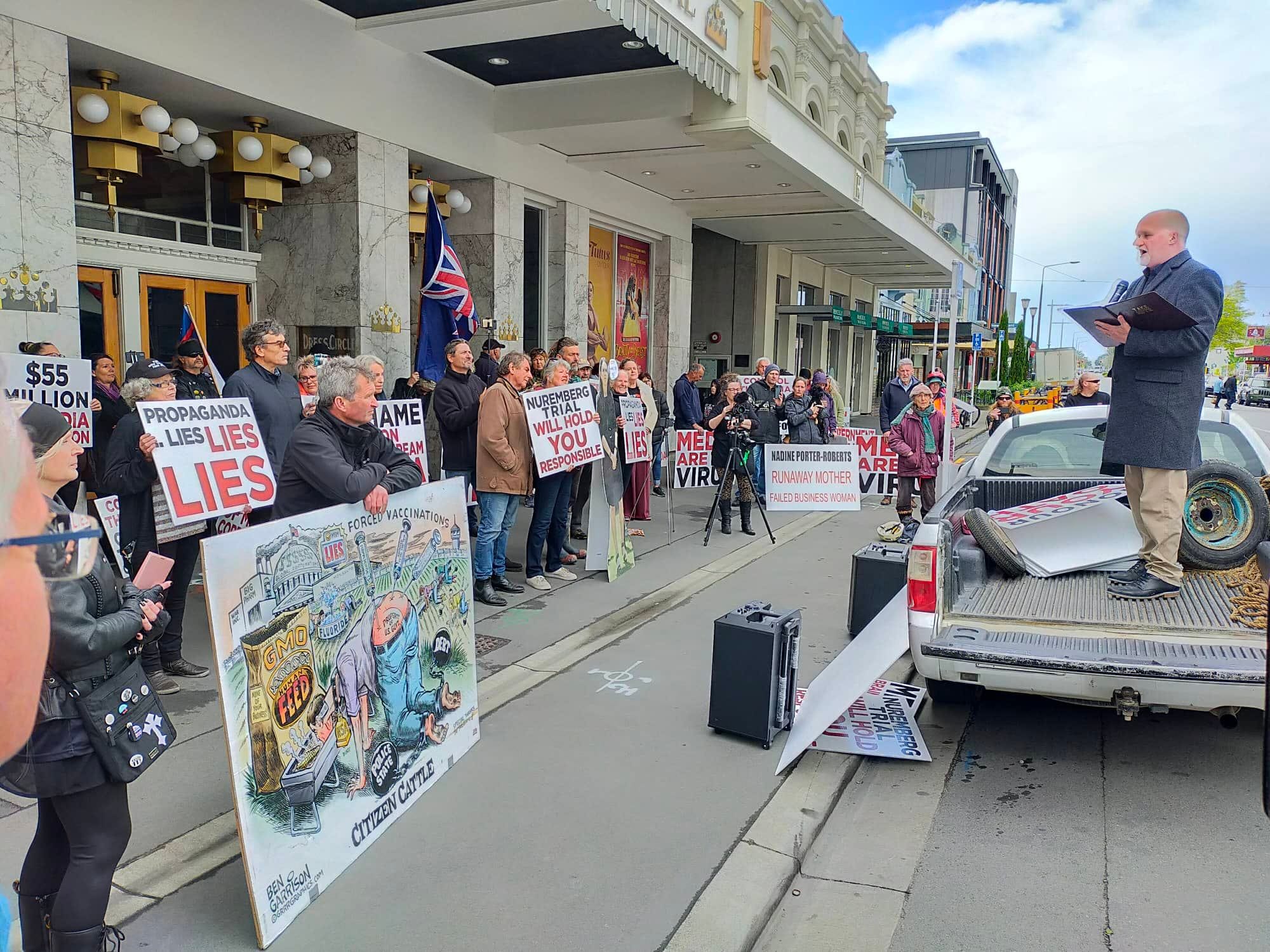 Organiser Colin Wightman says the purpose of the protest was to focus on the damage that the “bought-out mouthpiece” Stuff has inflicted on people through defamation. Mr Wightman, who was a candidate for the Waimakariri District Council in the recent local body election, says he was “named and defamed” by Stuff in the run-up to the election. https://www.stuff.co.nz/national/129606696/third-canterbury-council-has-candidates-with-conspiracy-links.
