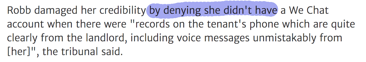 “Robb damaged her credibility by denying she didn’t have a We Chat account when there were “records on the tenant’s phone which are quite clearly from the landlord, including voice messages unmistakably from [her]”, the tribunal said.”