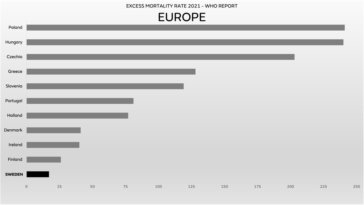 Although the determination of pro-mandate fanatics to exclusively compare Sweden to other Scandinavian countries is nonsensical, the 2021 excess mortality rates show Sweden with lower numbers than both Finland and Denmark.