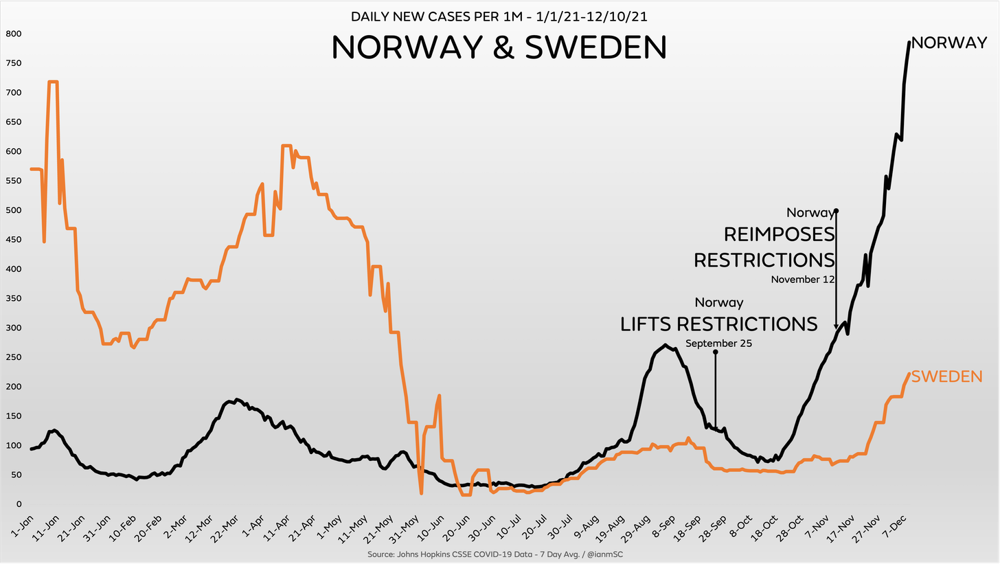 Revisiting the overall chart from 2020-2021, it’s important to highlight several other countries that had much stricter rules than Sweden: