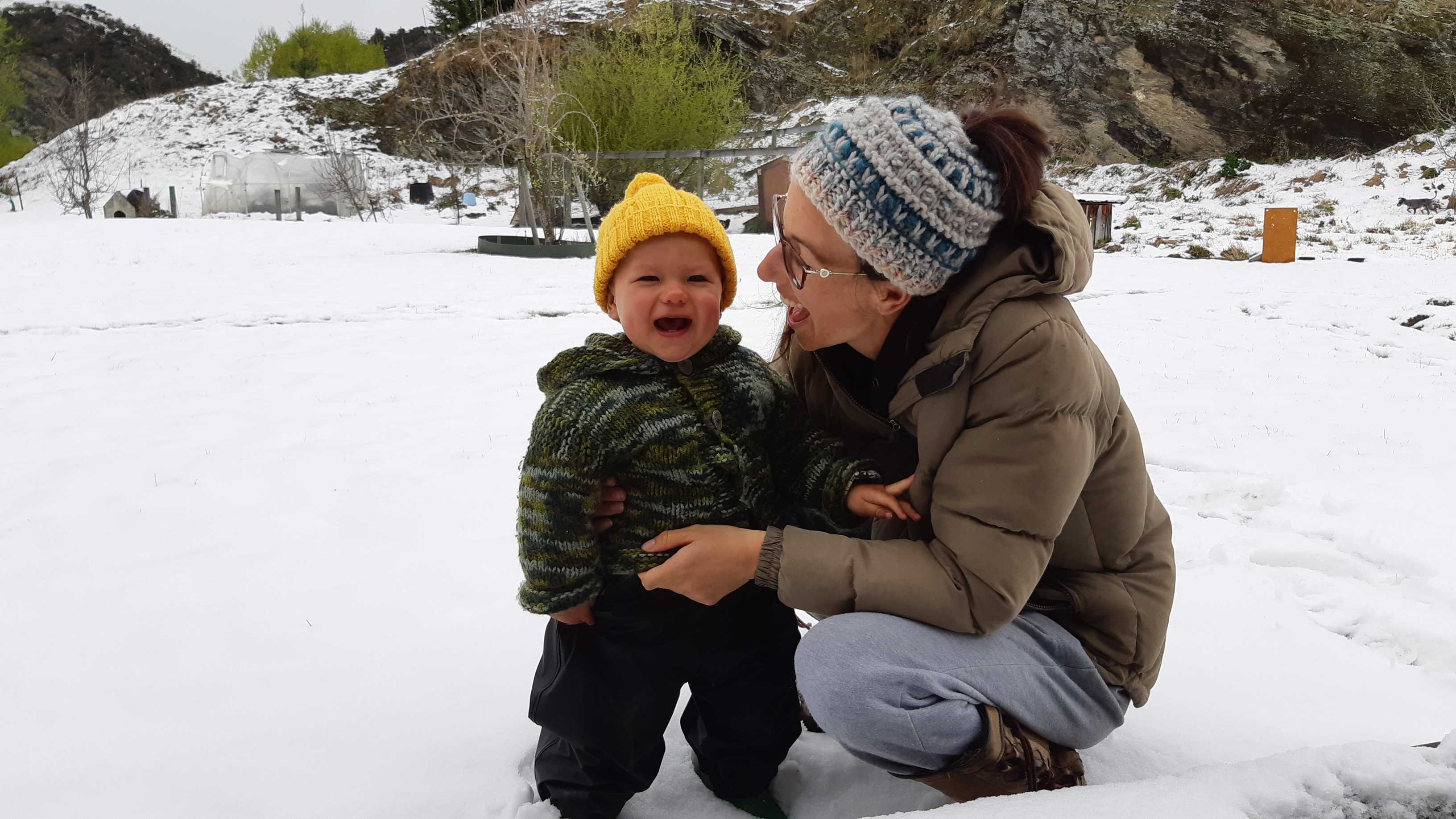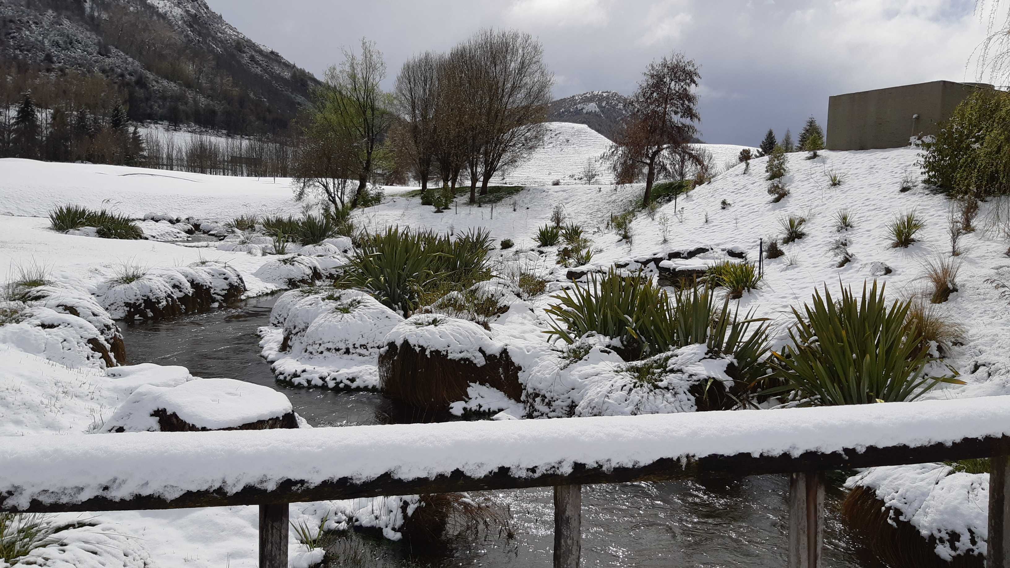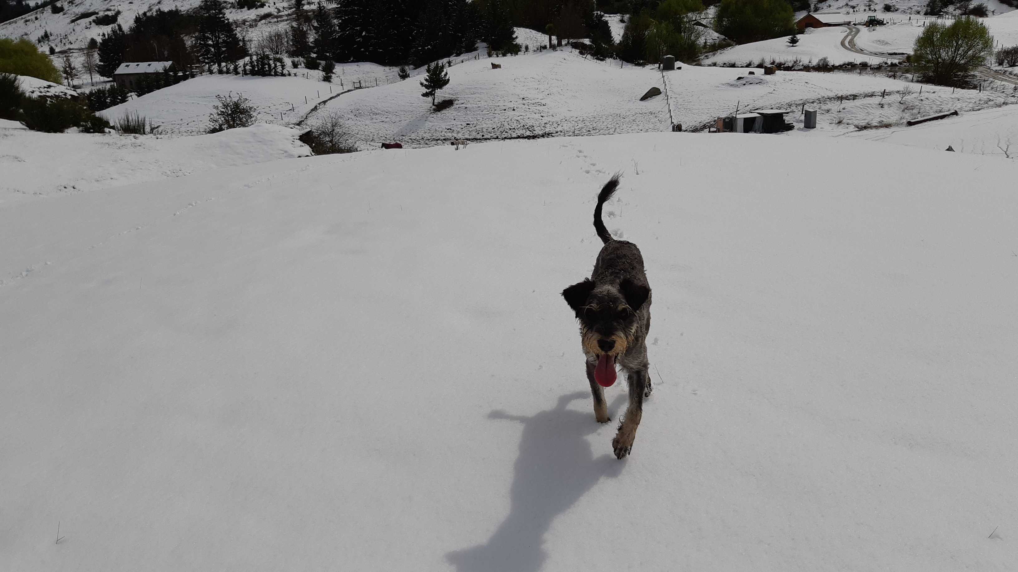 By 10am it was all on with about 10cms already on my deck. Photo: ExPFC, The BFD.Western entrance to Millbrook. Photo: ExPFC, The BFD.Mill Stream, Millbrook. Photo: ExPFC, The BFD.A lovely wee cottage in Arrowtown. Photo: ExPFC, The BFD.The ponies were playful this morning, they don’t seem to mind the snow at all. Photo: ExPFC, TheBFD.Arrowtown water race, looking toward Coronet Peak. Duck on the right clearly winning! Photo: ExPFC, TheBFD.Every billboard should have a Kiwi flag by law! Photo: ExPFC, The BFD.Moseby the $16,000 dog enjoying a romp in the snow. Photo: ExPFC, The BFD.Coolest grandson in the world enjoying his first snow day. Photo: ExPFC, The BFD.Or maybe not! Photo: ExPFC, The BFD.Official TheBFD snow-plow. Photo: ExPFC, The BFD.