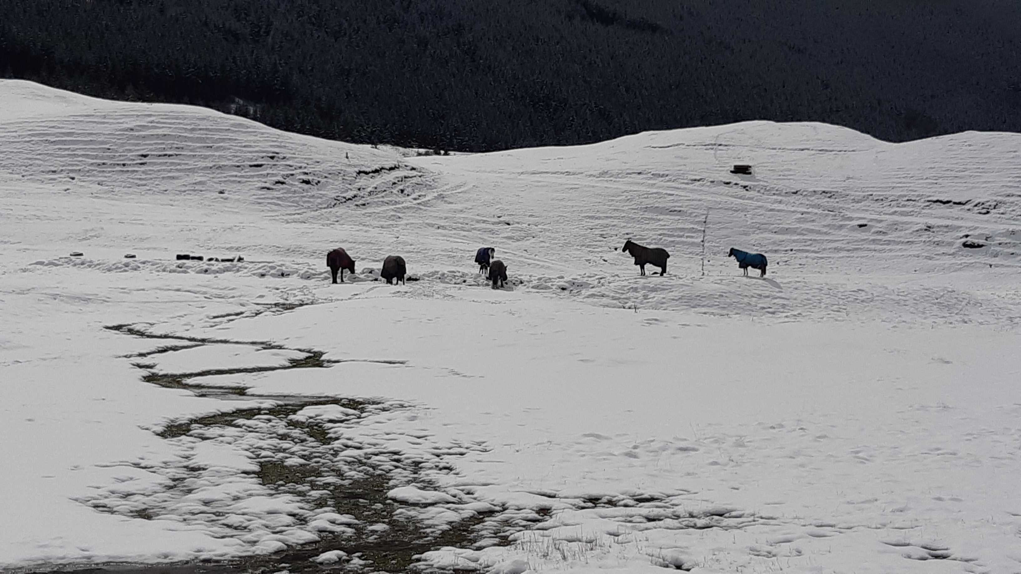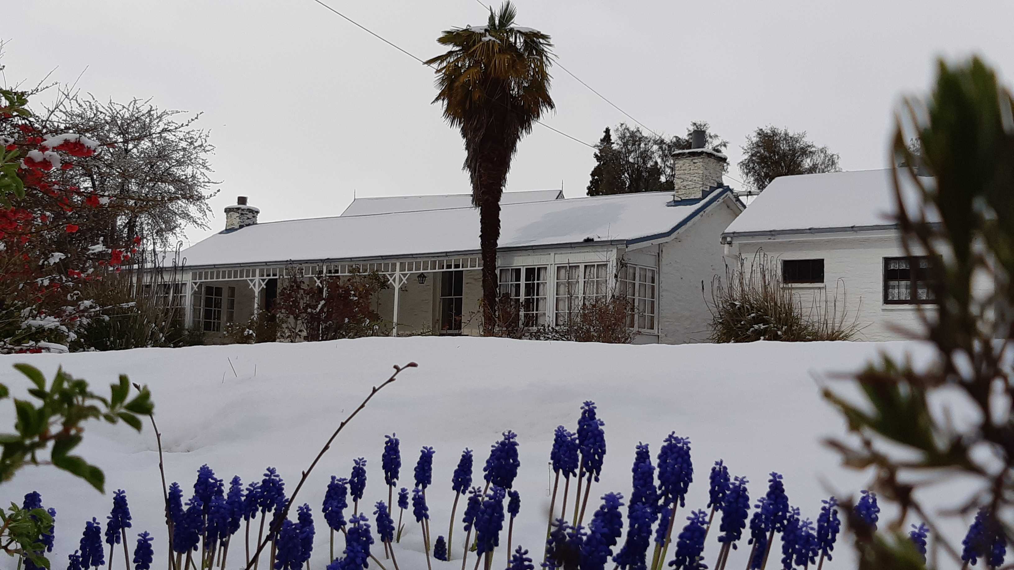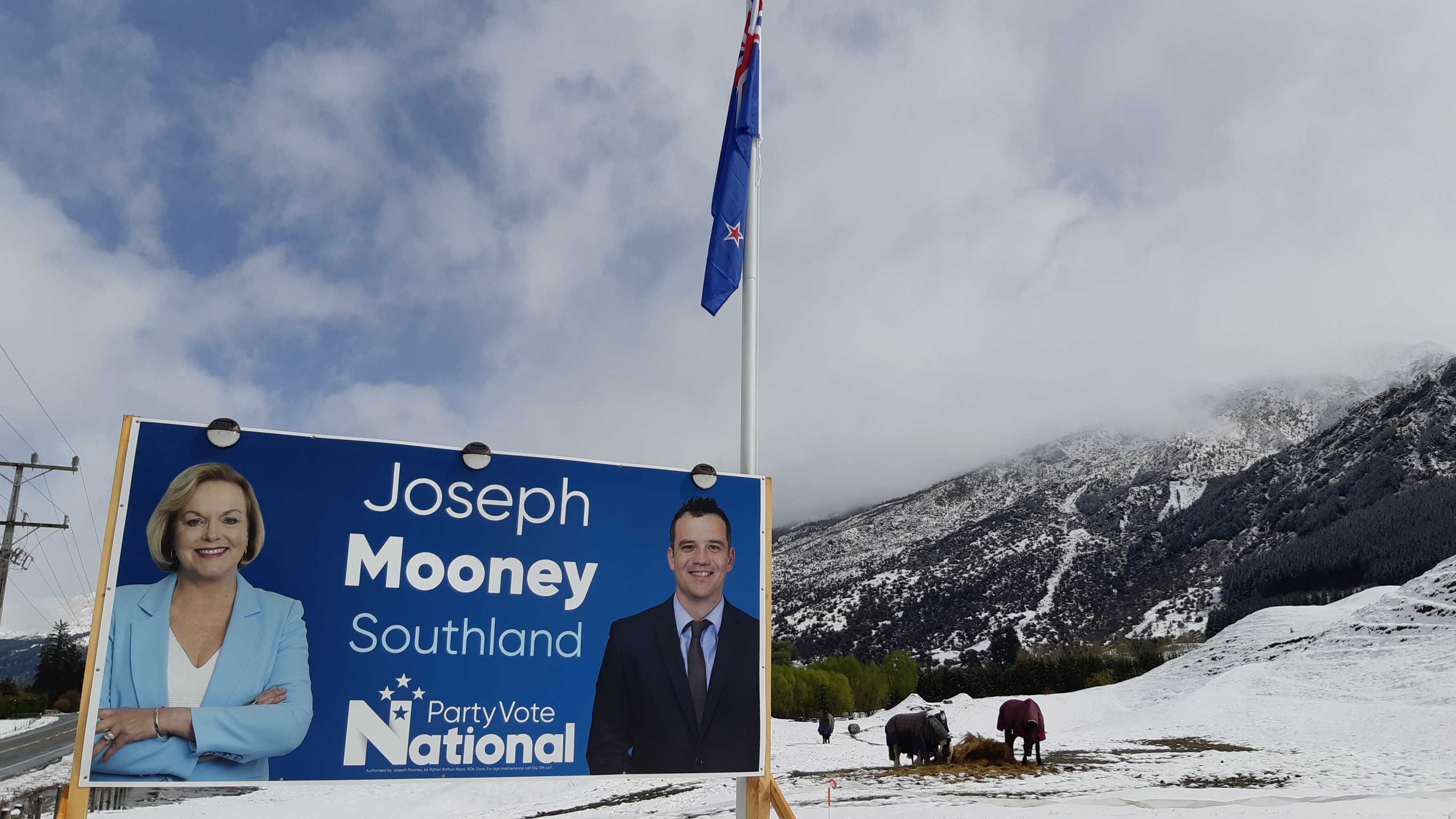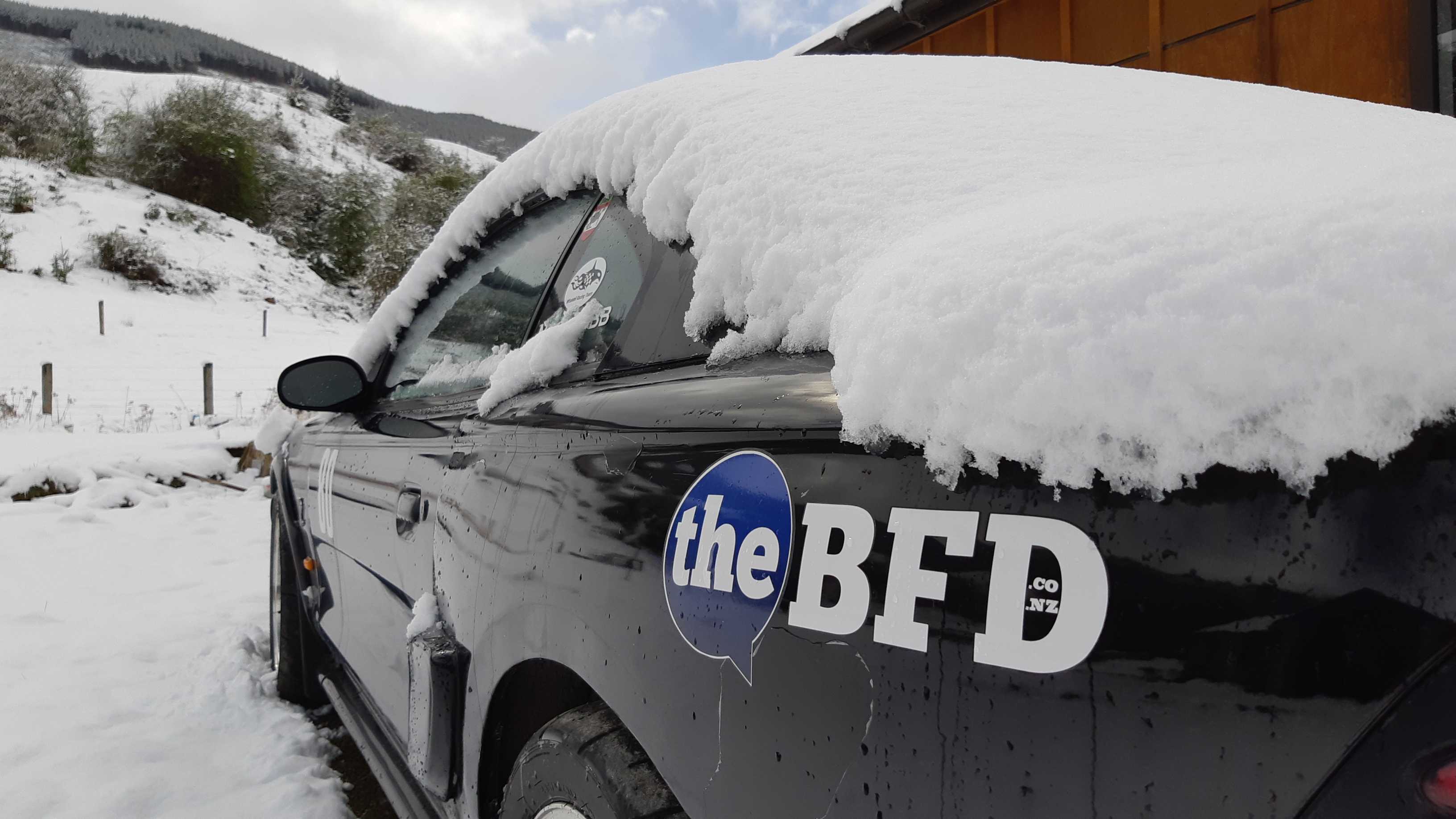 By 10am it was all on with about 10cms already on my deck. Photo: ExPFC, The BFD.Western entrance to Millbrook. Photo: ExPFC, The BFD.Mill Stream, Millbrook. Photo: ExPFC, The BFD.A lovely wee cottage in Arrowtown. Photo: ExPFC, The BFD.The ponies were playful this morning, they don’t seem to mind the snow at all. Photo: ExPFC, TheBFD.Arrowtown water race, looking toward Coronet Peak. Duck on the right clearly winning! Photo: ExPFC, TheBFD.Every billboard should have a Kiwi flag by law! Photo: ExPFC, The BFD.Moseby the $16,000 dog enjoying a romp in the snow. Photo: ExPFC, The BFD.Coolest grandson in the world enjoying his first snow day. Photo: ExPFC, The BFD.Or maybe not! Photo: ExPFC, The BFD.Official TheBFD snow-plow. Photo: ExPFC, The BFD.
