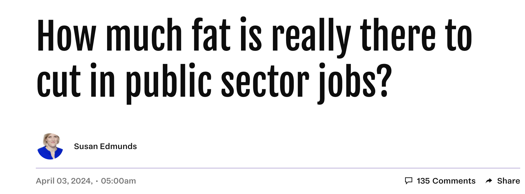 Stuff had an article yesterday asking how much fat can be trimmed off public sector jobs. I would suggest that the answer is plenty, plus some more. Stuff, however, thinks such thoughts are too simplistic.