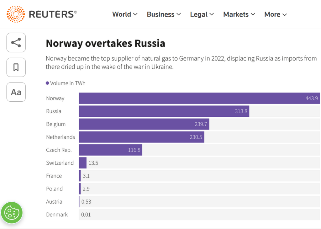 One point Sy does not much stress, but it is worth saying more about, is that Norway and the USA are of course the two countries who have benefitted financially, to an enormous degree, from blowing up the pipeline.