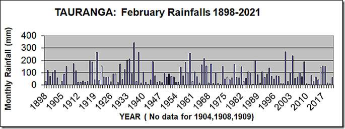 Rainfalls for the month of February have been recorded in Tauranga since 1898 (except for 1904, 1908, and 1909).