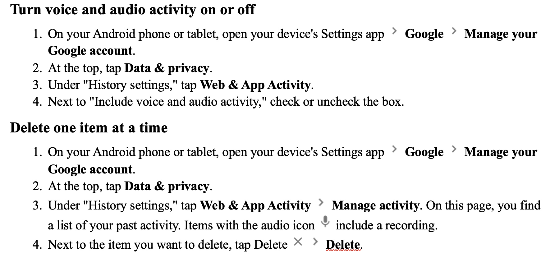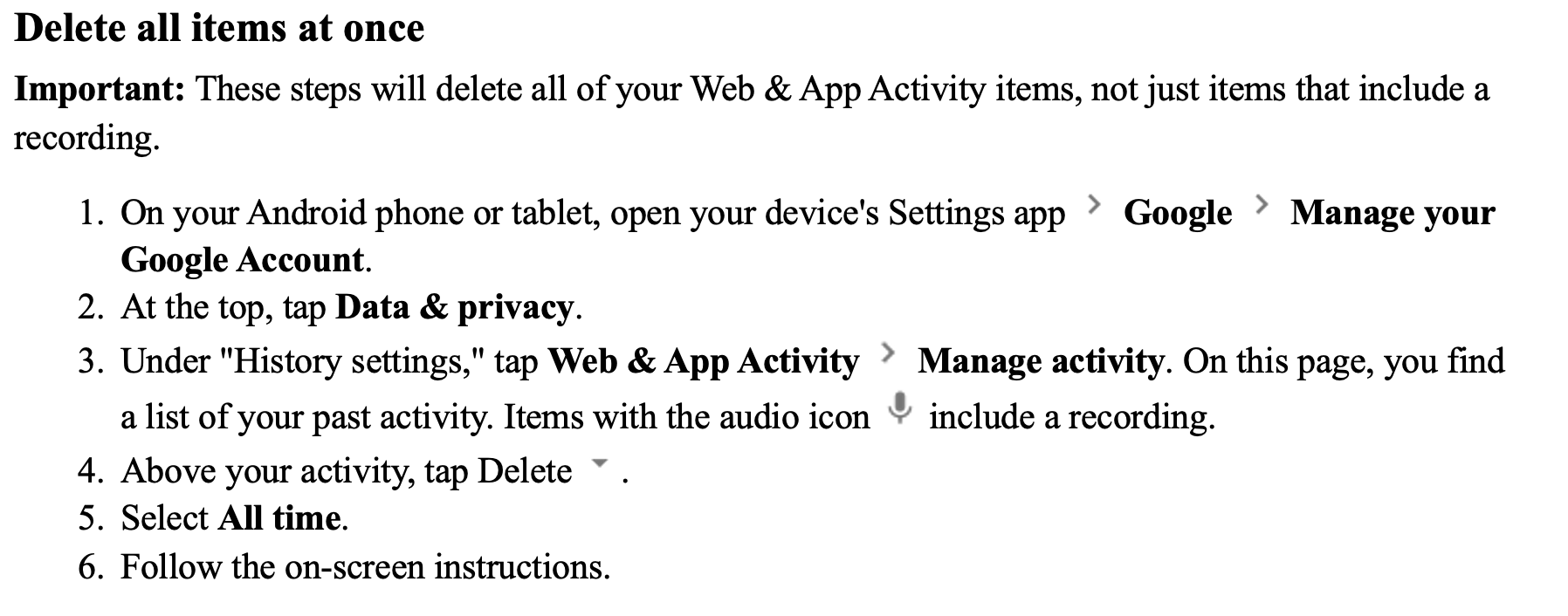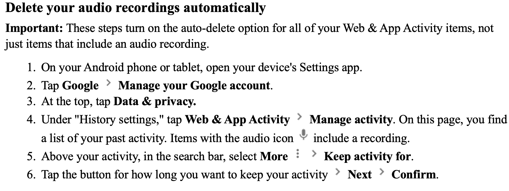 I’ve set mine up to automatically delete the input at the minimum time, 3 months. In my opinion, these instructions are designed to dissuade you from amending the defaults, which are to give Google everything.