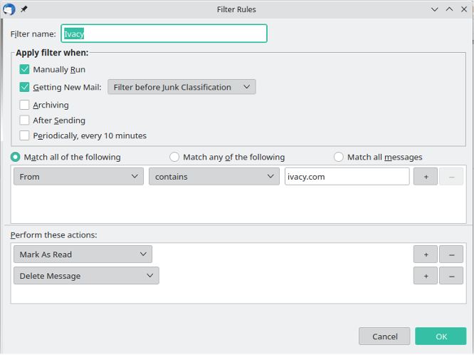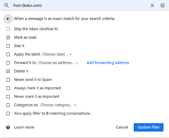 Here’s the action page from one I set up for emails from Kobo that annoyed me.