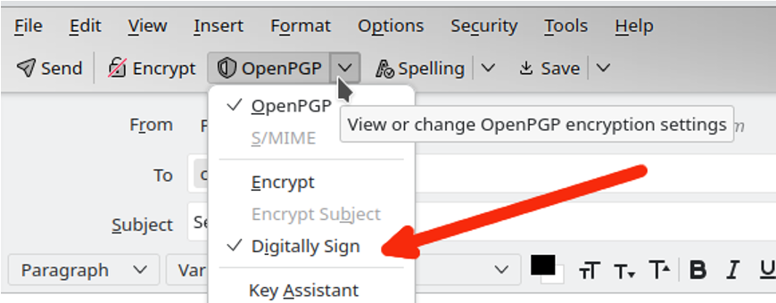 9. Send an email to the other party in the proposed secure channel and digitally sign it (This option is located under the drop-down menu adjacent to the Encrypt icon in the top menu).