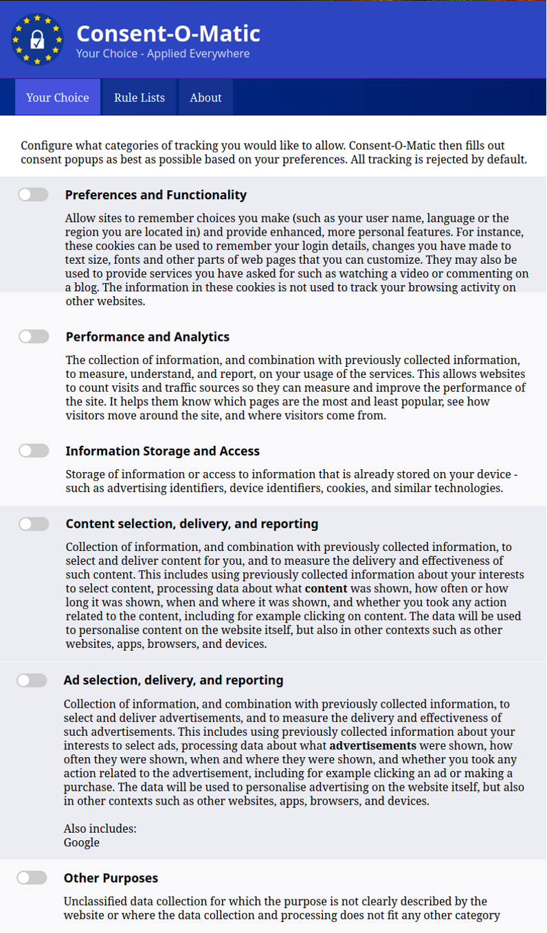 A group of researchers from Aarhus University, Denmark, like me, got tired of this nonsense and developed the Consent-O-Matic browser add-on. This add-on is designed to automatically fill in the pop-up with your choices if you could actually understand the words used in the pop-up.