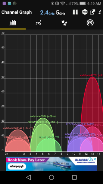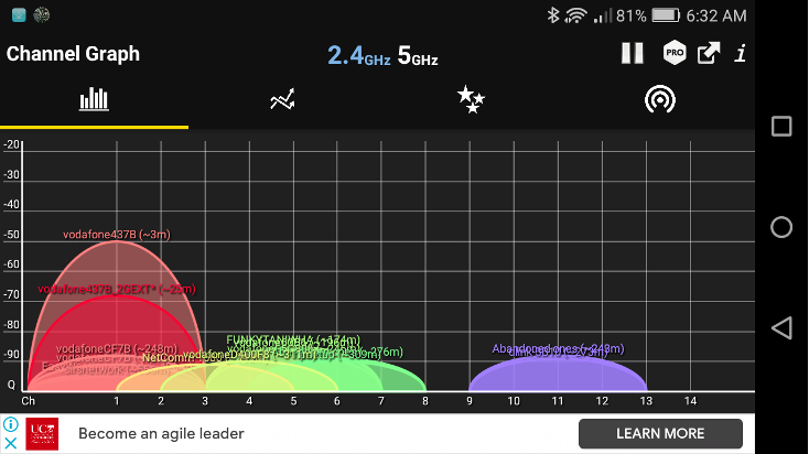 The app will show you what channel strengths you are receiving, and whether there are too many users on a channel. We will refer to this information, and what to do about it, further on in the articles. Run the app and move around your home to see if there are dead spots, areas with more interference, and so on. Sometimes you can solve things by sitting in a different spot to do your surfing.