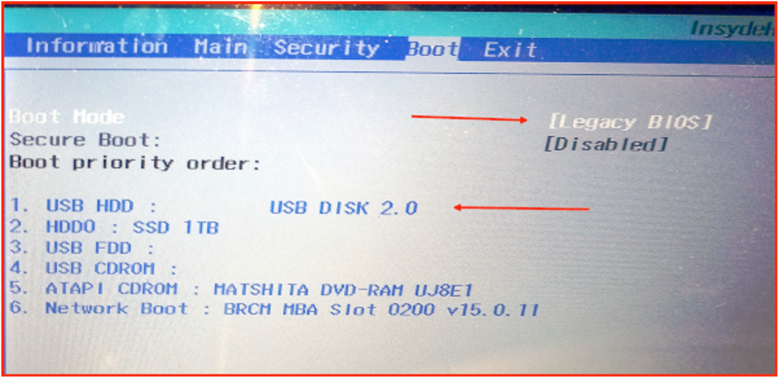 Here is what my Acer laptop looks like. Yours may be different, and you may need to hunt for this setting. Use the adjacent instructions to bring the Linux USB to the top of the list.