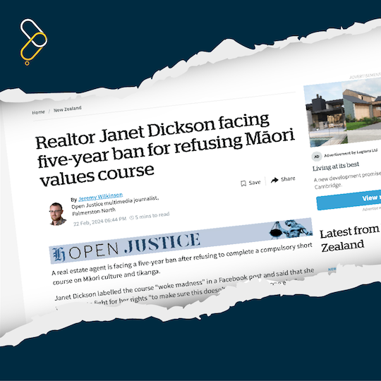 As I shared with you previously, the Real Estate Authority (REA) said they were going to cancel real estate agent Janet Dickson’s licence for five years because she would not take a compulsory Maori culture course.