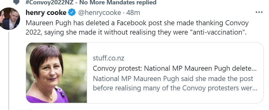 Maureen Pugh is the National representative for West Coast Tasman. They are a straightforward, pragmatic lot on the West Coast, as well she knows. She was right to thank the Convoy, and no doubt she meant it… but has now been told to take it down. Shameful tactics from their shiny new leader.
