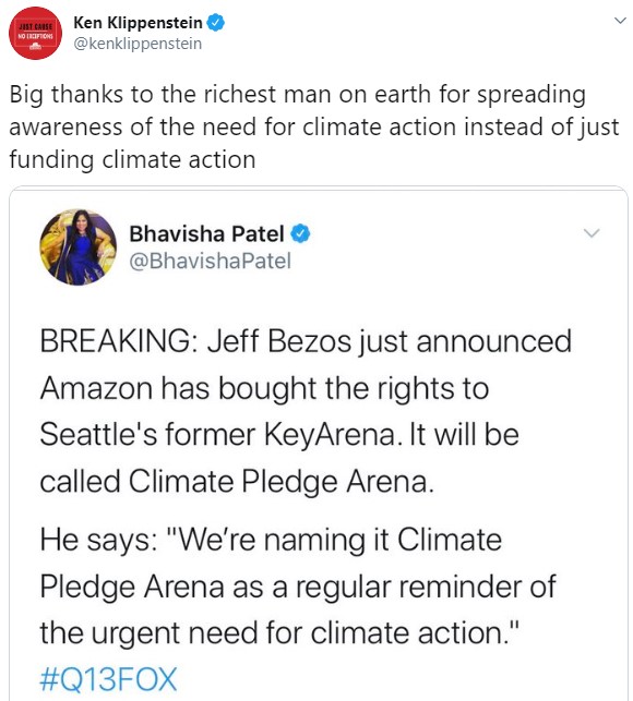 I’m excited to announce that Amazon has bought the naming rights to the historic Seattle arena previously known as KeyArena,” he wrote. “Instead of calling it Amazon Arena, we’re naming it Climate Pledge Arena as a regular reminder of the urgent need for climate action.