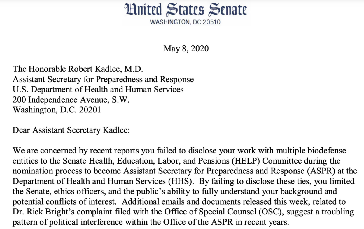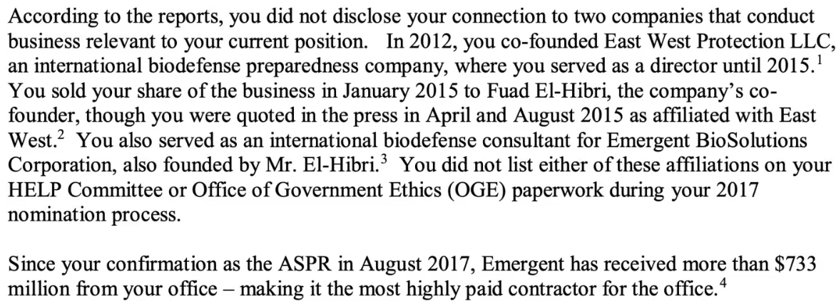 On his appointment as Assistant Secretary for Preparedness and Response (ASPR) in 2017, Kadlec failed to declare a conflict of interests on his ethics forms, that in 2012 he and El-Hibri had co-founded an international biodefence company called East West Solutions LLC or that he had been employed by Emergent BioSolutions as a consultant.