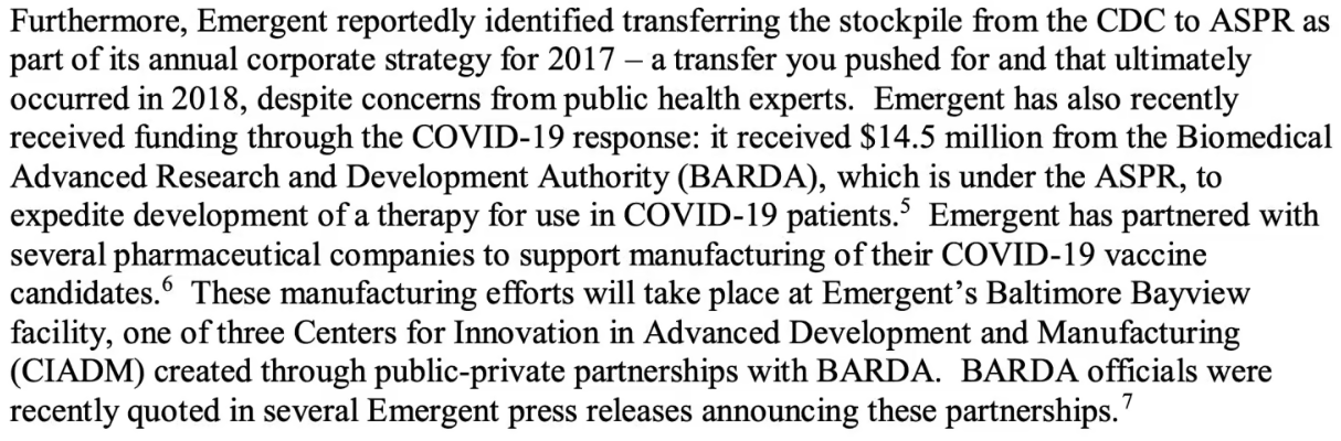 In September 2019, when Kadlec was ASPR and in control of the US national stockpile, Emergent BioSolutions was awarded a 10-year $2 billion contract to replenish the US national stockpile of smallpox vaccine.